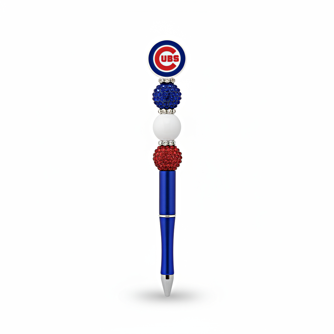 Fly the W! Show your Chicago pride with this Cubs-themed beaded pen. It features the classic logo topper and a stack of vibrant blue, red, and white beads with rhinestone sparkle.