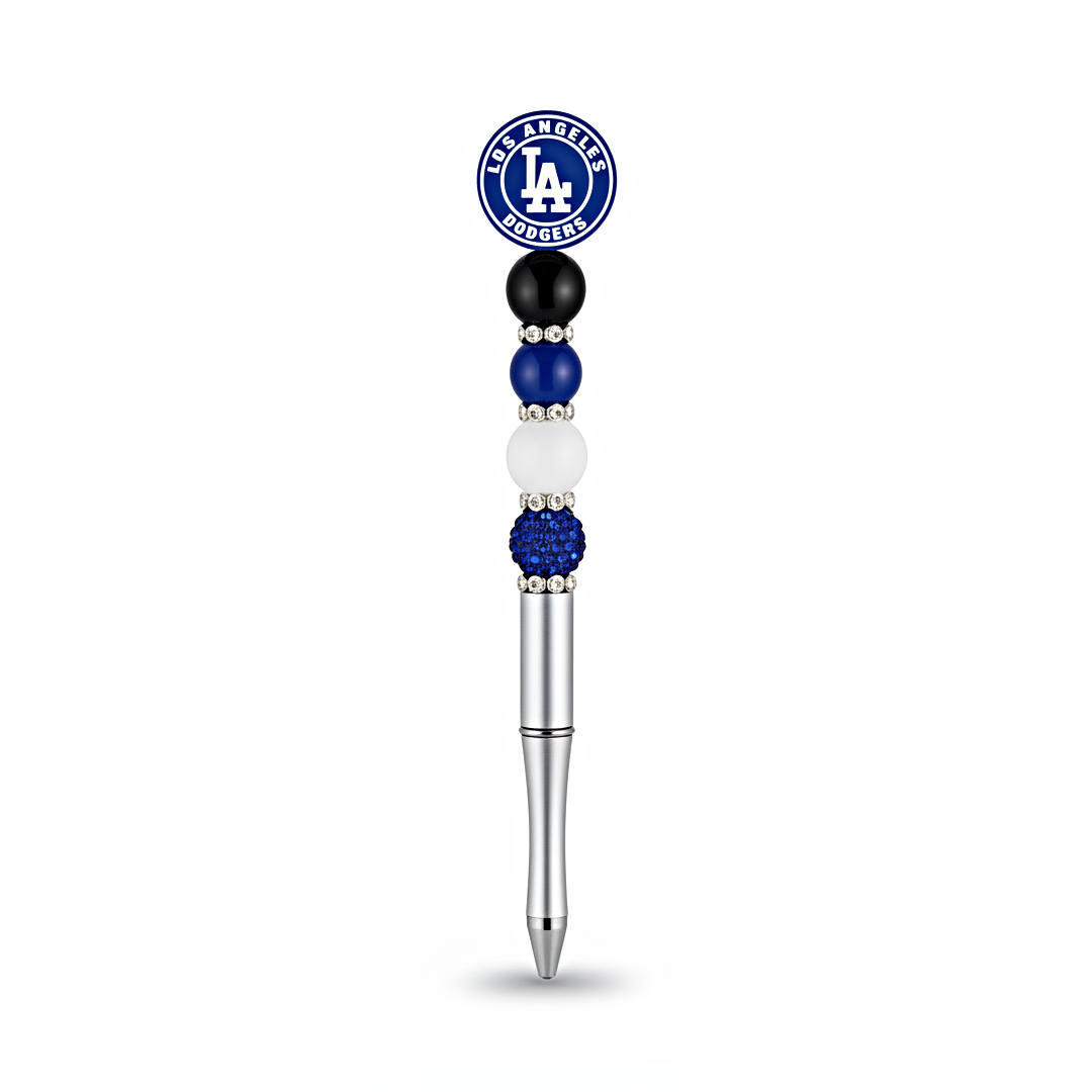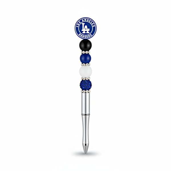 Think Blue! This classic Dodgers pen is a home run. It features the official team logo topper and a stack of glossy blue, black, and white beads with shimmering accents.