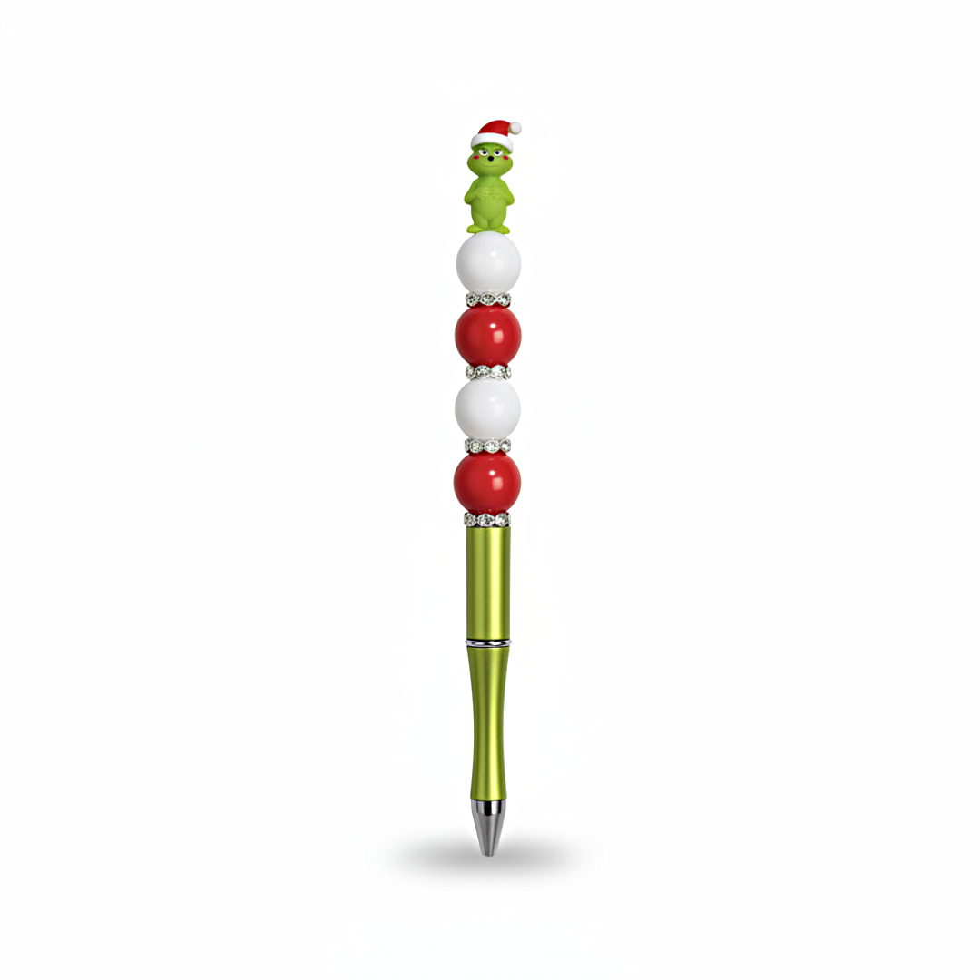 A Mean One! Add some mischievous flair to your holiday writing. This festive pen is topped with the Grinch himself and features a stack of Christmas red, white, and green beads.